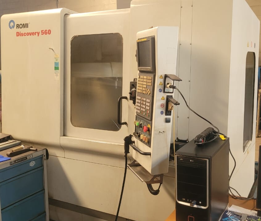 943 - CENTRO DE USINAGEM VERTICAL ROMI DISCOVERY 560 Ano - 2008 Comando CNC - FANUC Preparação para 4 eixo Cabeçote com 10.000 rpm Refrigeração interna pelo centro da ferramenta