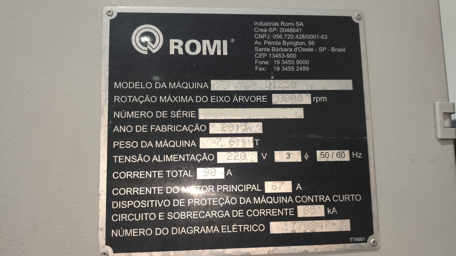 976 - CENTRO DE USINAGEM ROMI D1250 Ano - 2015 Comando CNC FANUC Transportador de cavacos Cabeçote 8.000 rpm